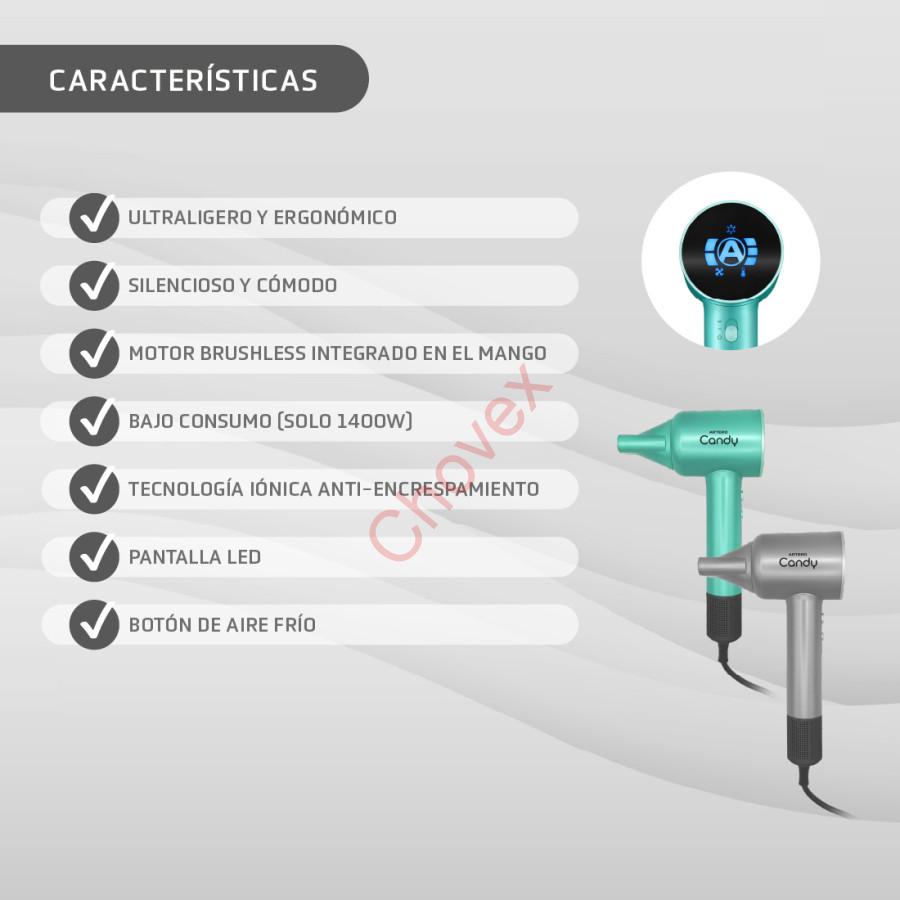 Vysokovýkonný ručný fén so zápornými iónmi. Vysokovýkonný bezuhlíkový motor. Úspora energie s maximálnym výkonom. Prívod vzduchu cez spodnú časť rukoväte zabraňuje upchávaniu. Odnímateľný magnetický filter. Dve rýchlosti a tri nastavenia teploty plus tlačidlo okamžitého chladenia. LED displej pre rýchlosť a teplotu. Vrátane magnetickej trysky.